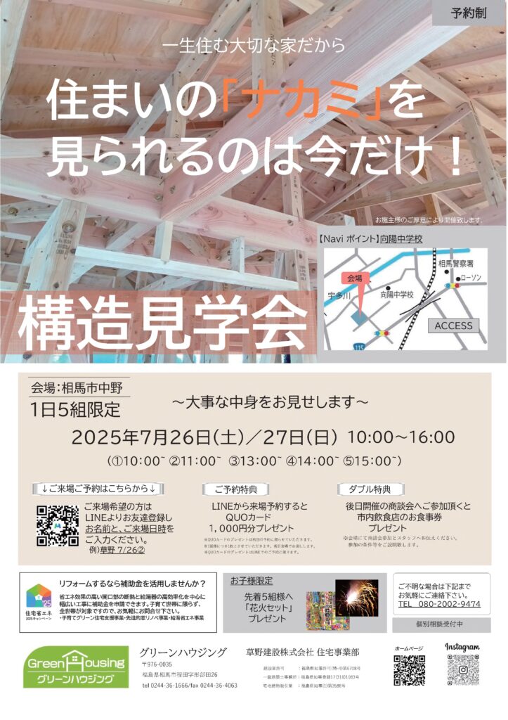 このたび、施主様のご厚意により、構造見学会を開催する運びとなりました。普段、目にすることが出来ない住まいの「ナカミ」を見ることが出来ます。皆様のご来場をお心より待ちしております。