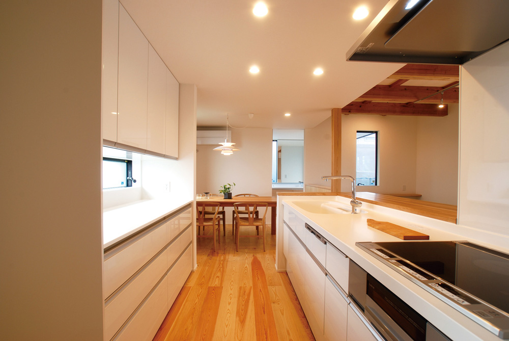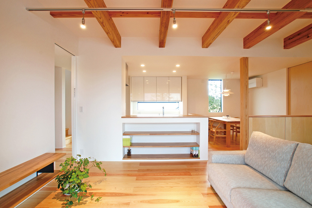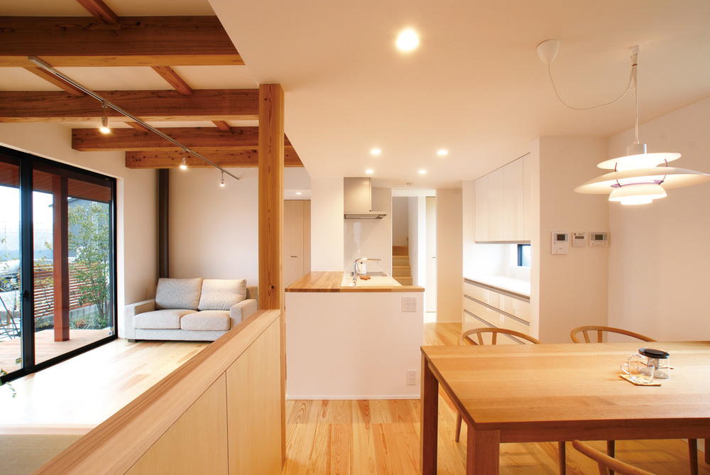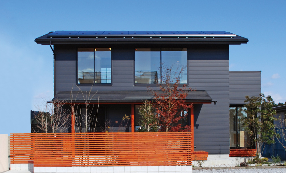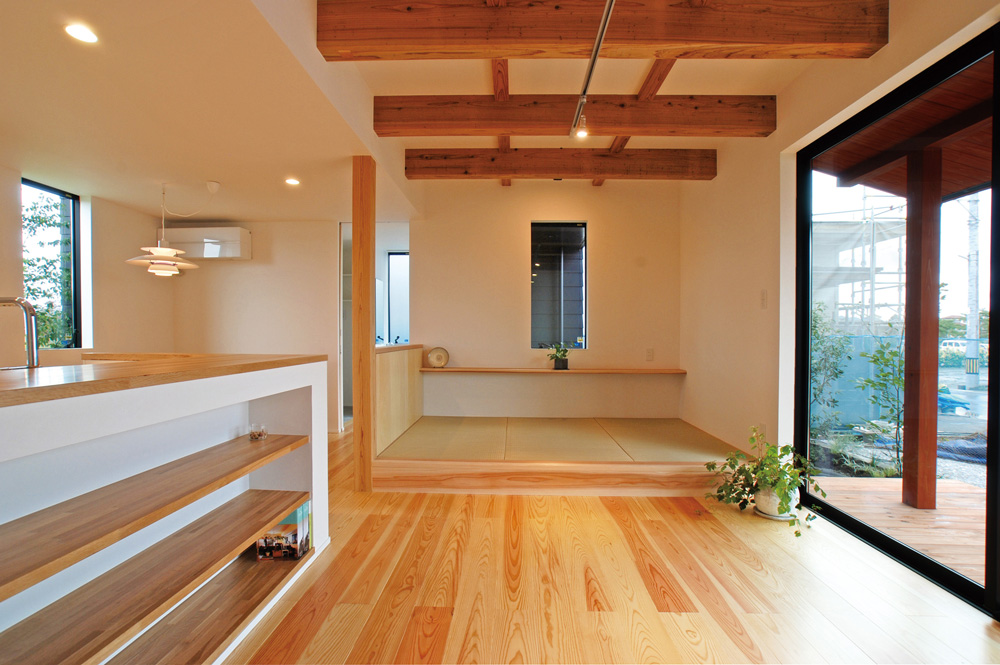 焼き板を張ったような渋い外観が目を引く、モダンな家。内装にも木材を多く使い、和と洋のテイストをミックスさせ、変化に富んだインテリアに仕上げました。家で過ごす時間が長くなりそうな心地よい工夫がいっぱいです。